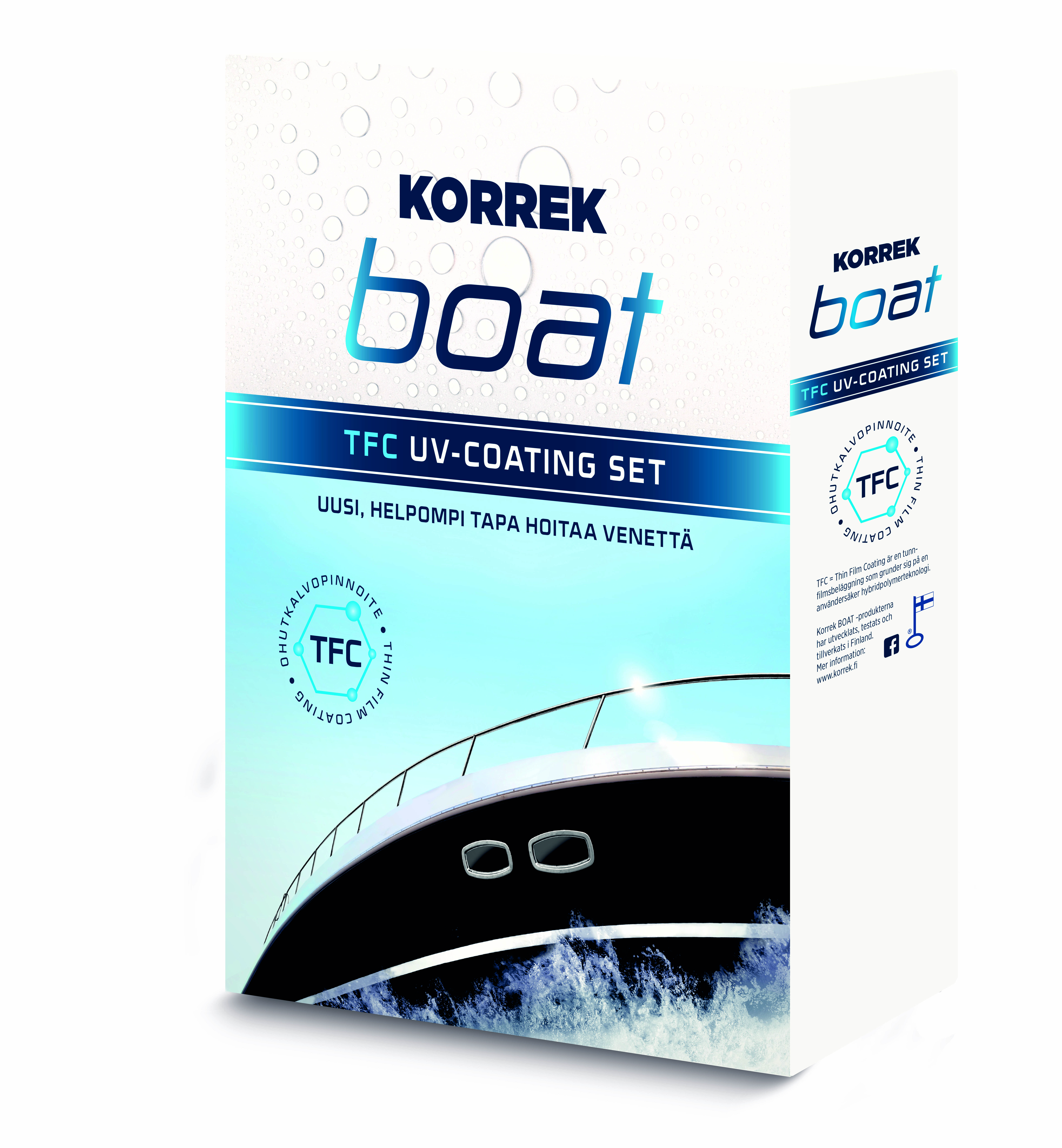 KORREK Boat -tuotesarja tekee veneenhoidosta vaivatonta hyödyntäen suomalaista ohutkalvopinnoiteteknologiaa, joka suojaa venettä tehokkaasti. Kaikki sarjan tuotteet on kehitetty, testattu ja valmistettu Suomessa. Veneen keraamisen suojapinnoitukseen tarvittavat välineet on kerätty valmiiksi KORREK Boat TFC™ UV Coating Settiin.